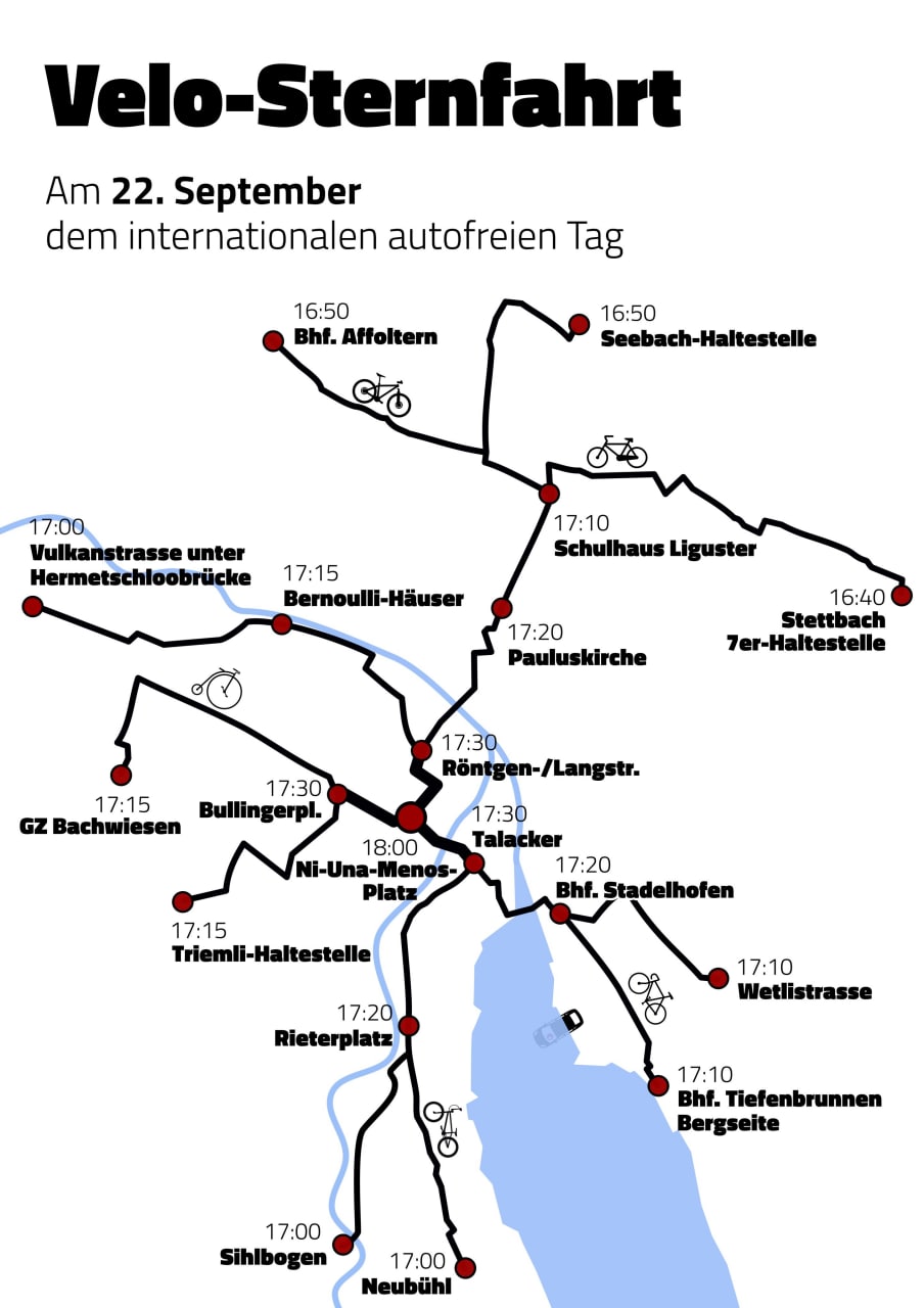 Jedes Jahr am 22. September gehen wir gemeinsam mit Verbündeten für das Velo auf die Strasse. Denn an diesem Datum findet der World Car-Free Day statt. Das Demo-Potenzial in Zürich ist gross. Denn die Veloinfrastruktur in Zürich ist immer noch unterirdisch. Im vergangenen Jahr konnten wir über 5000 Demonstrierende für das Velo zählen, in diesem Jahr soll die Demo noch grösser werden – also trag dir den 22. September ganz fett im Kalender ein, am besten gleich, also JETZT.