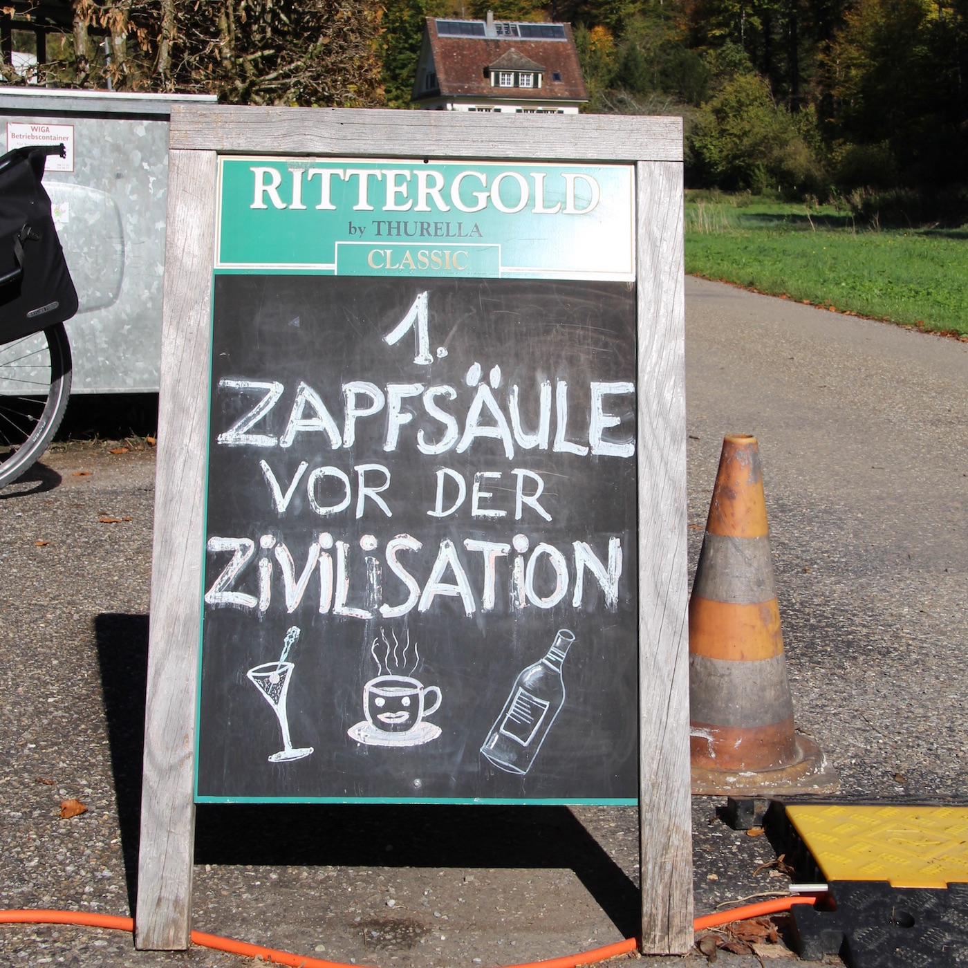 Nach einer weiteren Steigung erreichen wir wenige Minuten später bereits den Richterswiler Ortsteil Samstagern, rund 250 Meter über dem Zürichsee. Hier queren wir die Veloland-Route 32, der wir erst vierzig Kilometer später erneut begegnen werden. Weiter gehts, vorbei am Hüttnerseeli, in dem es sich im Sommer bestimmt trefflich baden und schwimmen lässt. Jetzt, anfangs Oktober, ist es dafür jedoch bereits deutlich zu frisch. Autos begegnen uns kaum, auch andere VelofahrerInnen sind nur selten zu sehen, wir haben die Strasse also für uns und geniessen das in vollen Zügen auf dem Weg nach Hütten. Von Hütten gehts im Schuss runter an die Sihl, dann auf einer menschenleeren Forststrasse dem Fluss entlang bis zur Brücke und zur Strasse hinauf nach Finstersee. Hier wartet der nächste Aufstieg, zuerst auf einer Hauptstrasse, die zwar nicht sehr stark befahren ist, dafür fahren die wenigen Autos umso schneller vorbei. Aber weit folgen wir der Strasse nicht, schon nach wenigen hundert Metern biegen wir links ab. Kurz unterhalb eines Bauernhofs halten wir neben einem Ziegengehege an und werden an den Film «Men who stare at Goats» erinnert. Die Ziegen starren uns nämlich an, bis wir den Blick abwenden und stattdessen die Aussicht übers Sihltal bewundern. Wenigstens fällt niemand tot um, auch keine der Geissen, wie das im Film geschieht.