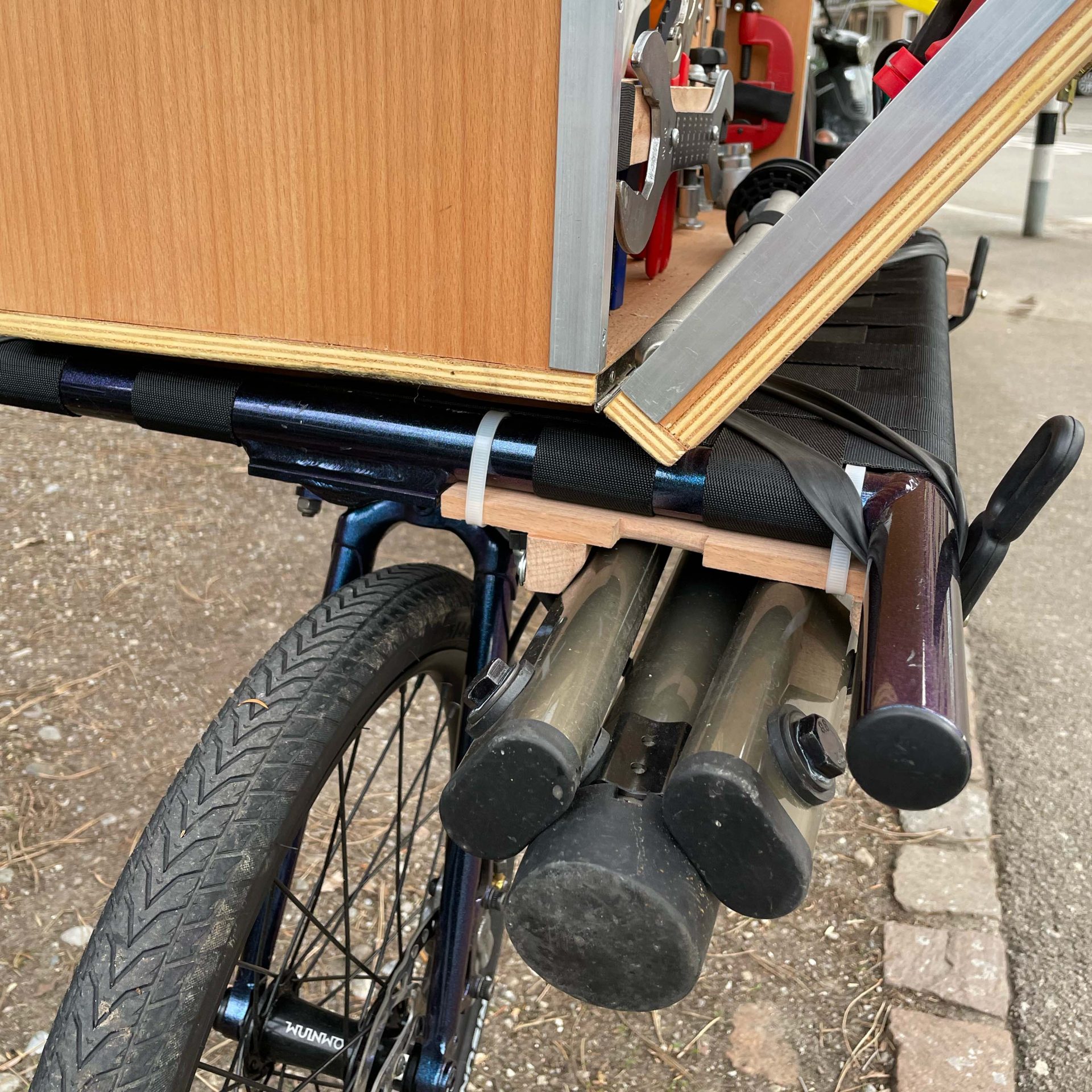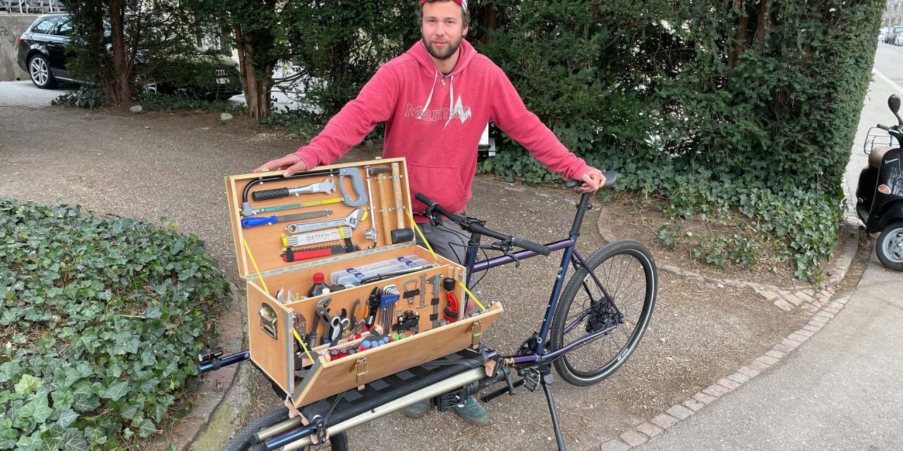 Natürlich kommt Velo Vici mit dem Velo, einem hübschen dänischen Omnium in der Farbe Blurple, zu seiner Kundschaft. Für das Lastenvelo hat Pascal eine Werkzeugkiste gezimmert, «nur so mal provisorisch», erzählt der mobile Mechaniker. In der Zwischenzeit habe sich das Teil jedoch als ziemlich perfekt erwiesen. In der Kiste ist alles drin, was es für einen Service oder eine Reparatur braucht, und unter der Kiste hängt zusätzlich ein Reparaturständer. Nur eine Beschriftung fehlt noch, aber immerhin ein schönes Logo hat Pascal für seinen Einmannbetrieb bereits kreiert.