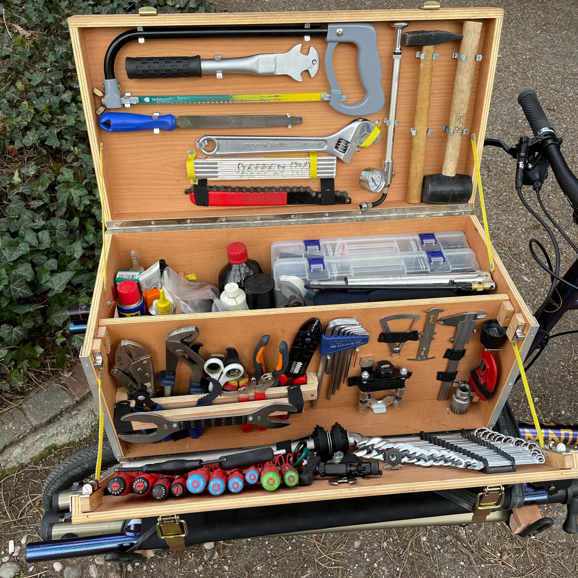 Die selbst gezimmerte Werkstattkiste mit allen wichtigen Tools.