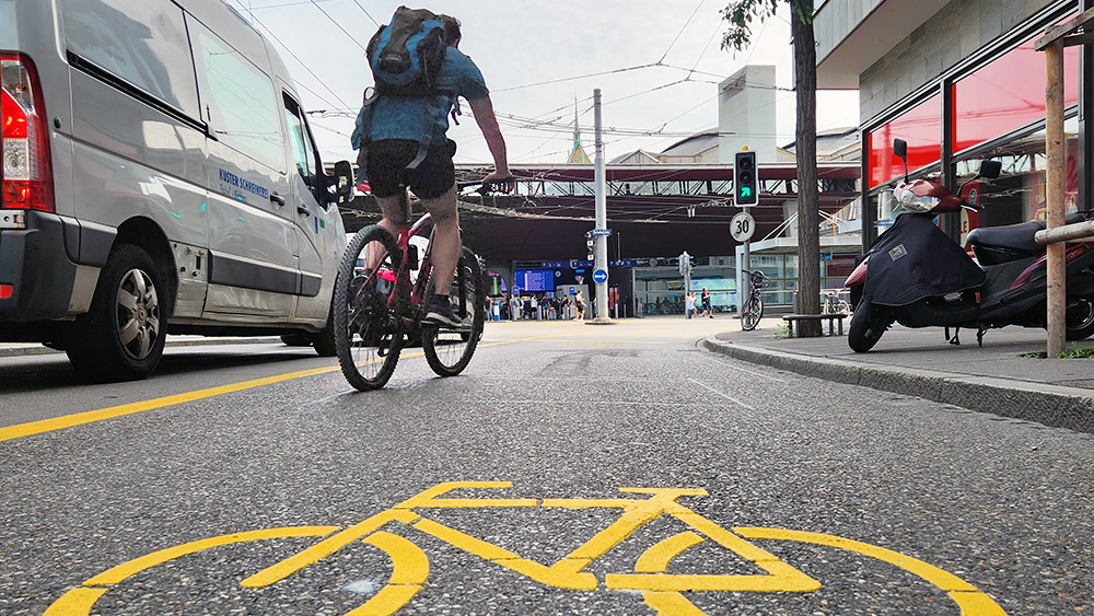 Doch jetzt hat die Stadt gehandelt: Zwischen der Löwenstrasse und der Schweizergasse hat sie eine der Autospuren in eine sogenannte «Umweltspur» umgewandelt. Diese Spur gilt ausschliesslich für Bus, Taxi und eben auch Velos! Eine kurze, aber wichtige Strecke wurde somit für den Veloverkehr freigespielt, was bei der bisher inexistenten Veloführung über den Bahnhofsplatz höchste Zeit war – ein kleiner Durchbruch verbunden mit der grossen Hoffnung, dass die Umverteilungs-Ankündigungen endlich greifen.