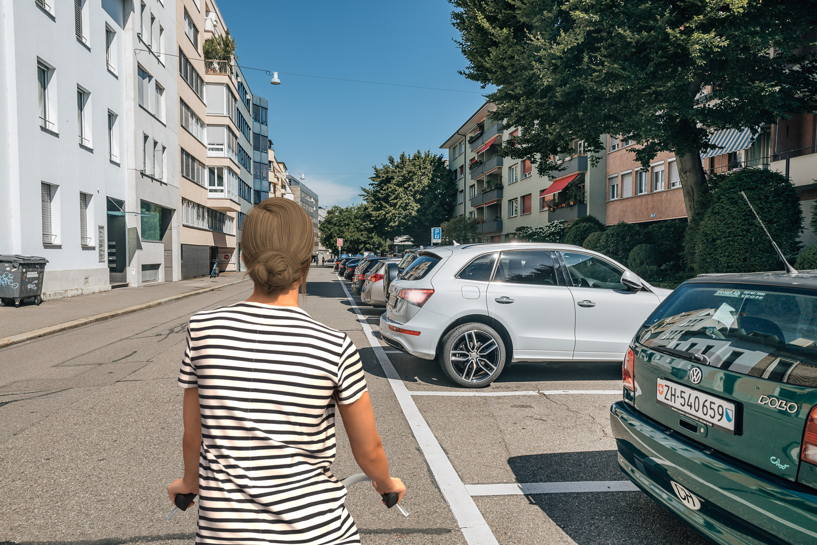 In einer Situation, in der Velofahrende mit Abstand an Parkplätzen vorbeifahren müssen, ist die Kompetenz gefordert, die Gefahr von rückwärtsfahrenden Autos zu erkennen und dieser Gefahr entsprechend auszuweichen. Abstand ist auch bei seitlich parkierten Autos wichtig, um sich öffnende Autotüren und damit Dooring zu vermeiden. Obwohl der Vortritt rechtlich gesehen bei der Velofahrerin liegt, muss diese Gefahr antizipiert werden.