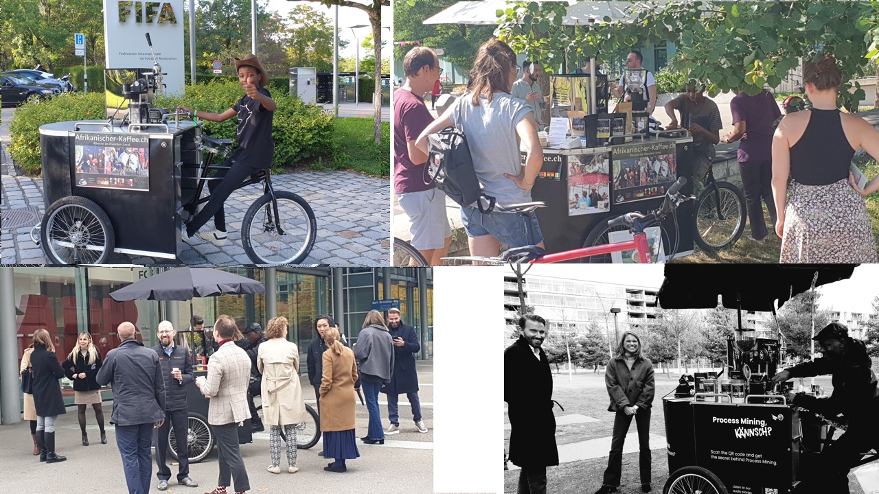 Mietkonditionen: Die Preise orientieren sich an der Ausschank-Dauer, Anzahl Kaffeegetränke und Entfernung und Art der Veranstaltung. Kostenbeispiele: Anlass in der Stadt Zürich, Ausschank-Dauer von sechs Stunden, inklusiv 100 Kaffees: 850 Franken. Kurzer Anlass in der Stadt Zürich: Ausschank während dreier Stunden, ab 500 Franken. Veranstaltungen in der Stadt bis zu rund acht Kilometer entfernt von unserer Basis radeln wir an. Für Strecken ab neun Kilometern, bei starkem Regen oder steilem Gelände transportieren wir das Kaffeemobil mit einem Mietlieferwagen.