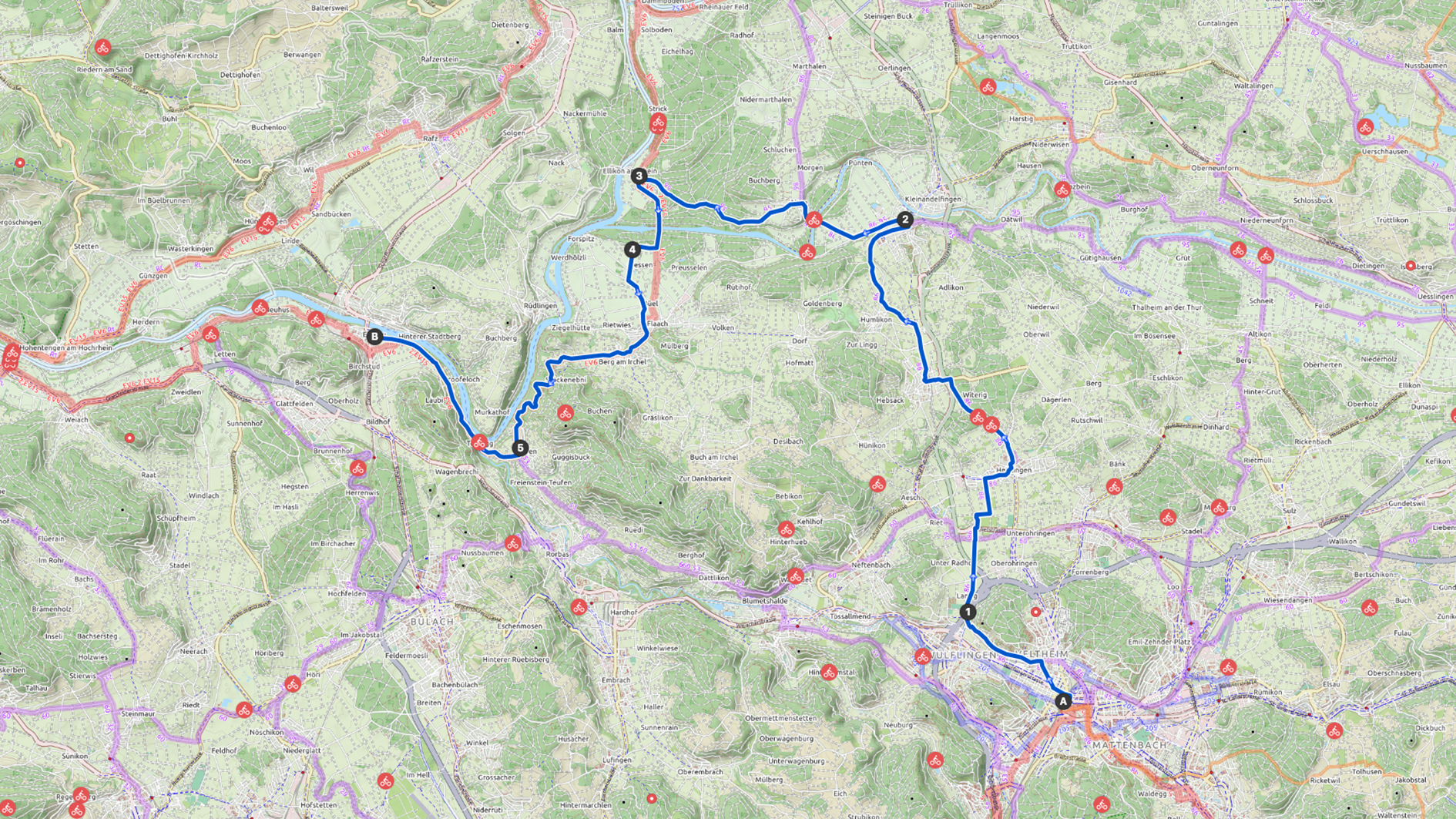 Der Track, den Komoot von A nach B vorschlägt, lässt sich beliebig verschieben, einfach daran ziehen – um etwa direkt an einer Sehenswürdigkeit vorbeigeführt zu werden. Spezielle Bauten, Naturspektakel oder einfach besonders hübsche Wegstellen sind auf den Karten als rote Punkte markiert, unter welchen Informationen hinterlegt sind – einfach mit der Maus drüber fahren.