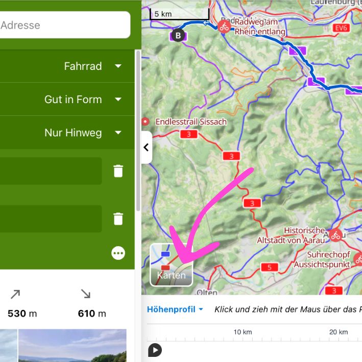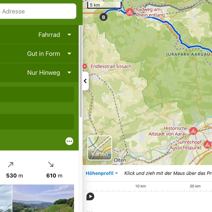 Toll ist auch, dass sich anwählen lässt, ob man mit dem Mountain Bike, Rennvelo, Gravel Bike oder Elektrorad unterwegs ist. So schlägt das Tool je nach Art des Velos eine andere Route von A nach B vor. Man sieht dann auch gleich, wie sich dadurch der Strassenbelag verändert. Sehr hilfreich ist das Profil und das Total an Höhenmetern und Kilometern, welche das Tool automatisch berechnet.