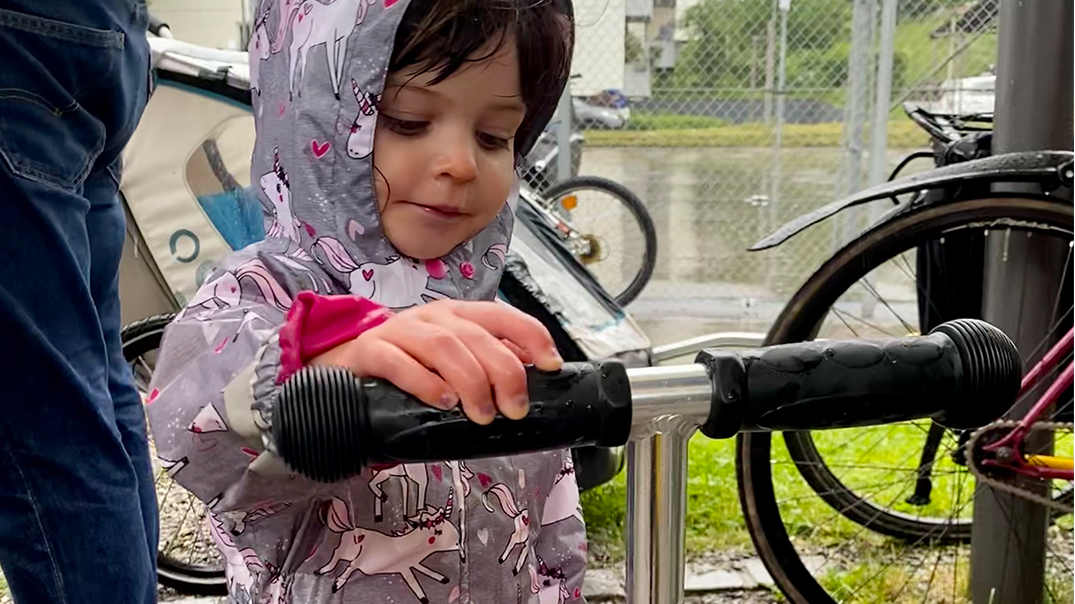 Es beginnt zu regnen. Bestens ausgerüstet, mit Pelerinen und Ganzkörper-Regenschützen, ist dies für uns Velofahrende jedoch kein Problem. Nass, aber glücklich kommen wir am Ende der Route an. Stolz gratuliere ich Maya, die die ganzen sechs Kilometer auf dem Trotti zurückgelegt hat.