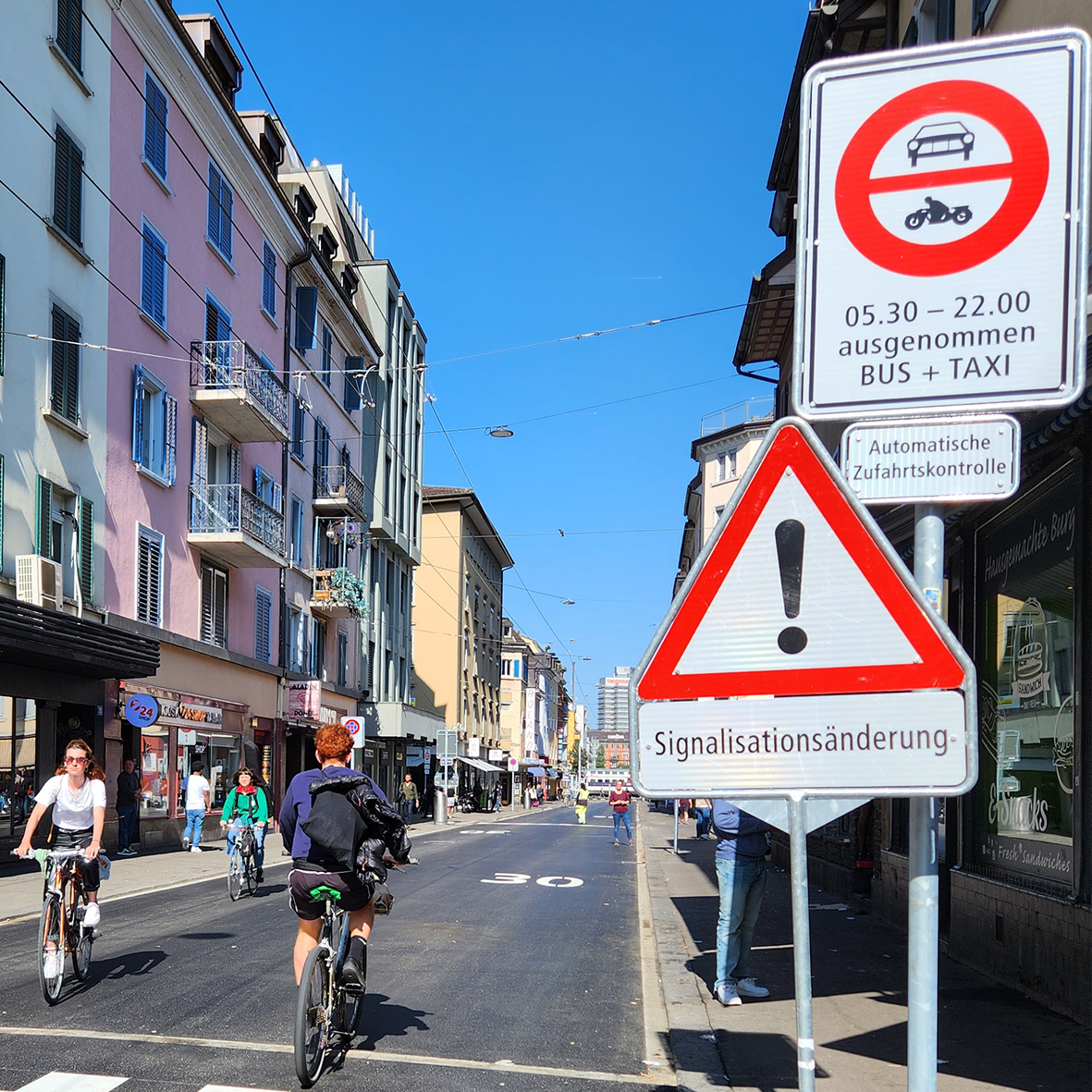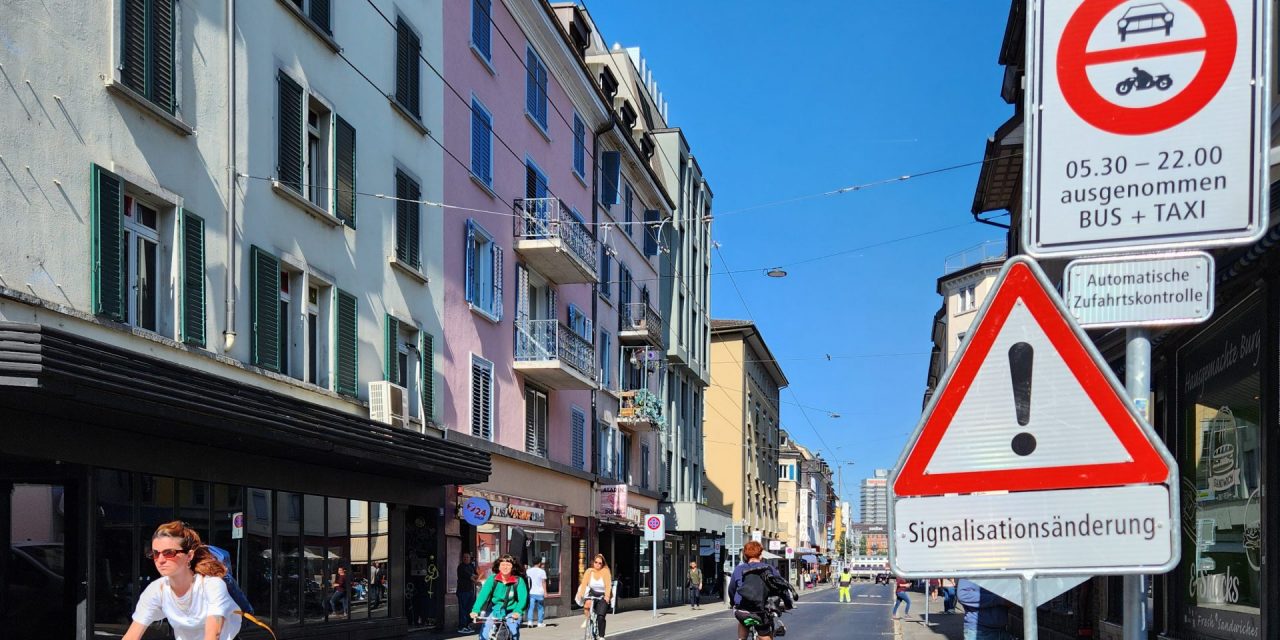 Mit einer neuen Verkehrsführung und Tempo 30 hat die Stadt die Situation für die Velofahrenden und den öffentlichen Verkehr an der Langstrasse verbessert. Um den Durchgangsverkehr zu reduzieren, dürfen ab dem 27. September 2023 tagsüber nur noch Velofahrende, Busse und Taxis die Langstrasse in beide Richtungen befahren. Für den Auto- und Motorradverkehr gilt tagsüber zwischen der Brauerstrasse und der Dienerstrasse ein Fahrverbot.