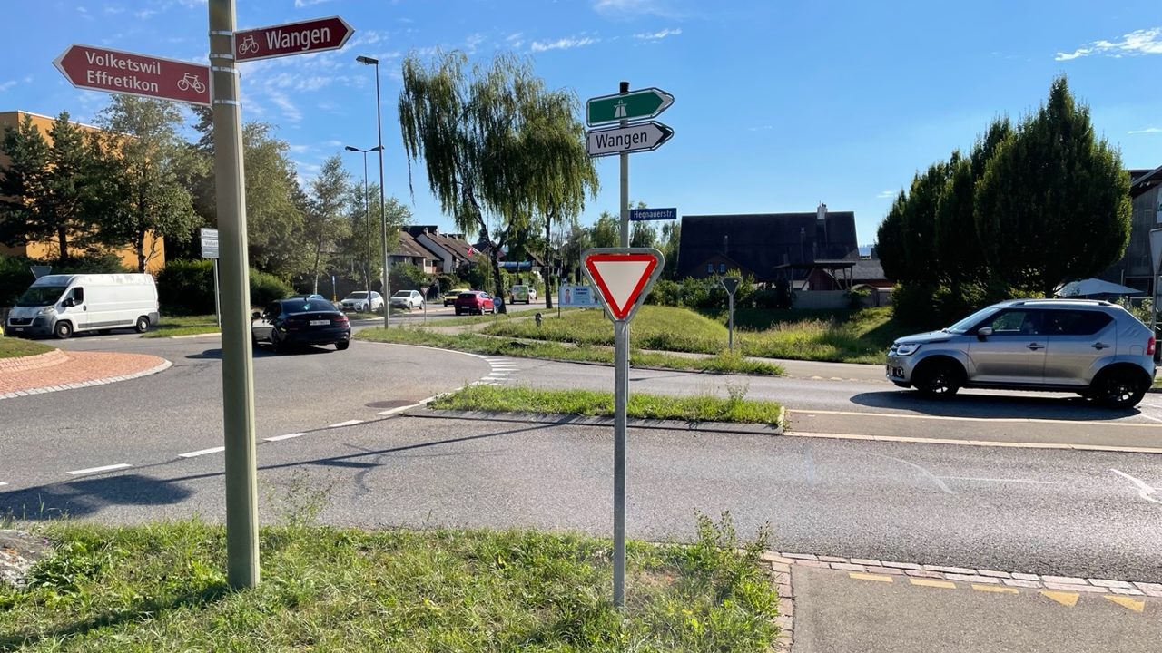 Velofahrende kommen auf der Abfahrt Richtung Hegnauer Kreisel mit Schuss auf diese sehr unübersichtliche Einmündung zu, werden aber dann durch das Vortrittssignal auf null abgebremst.