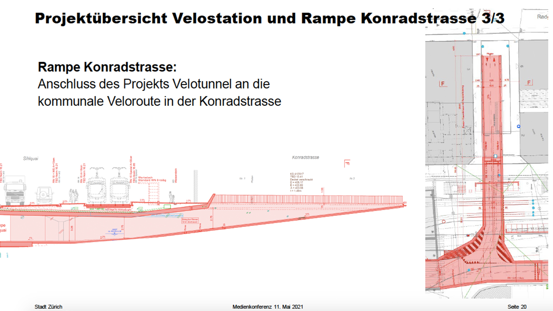 Kritische Stimmen meinen der Velotunnel sei ein Luxusprojekt für eine Minderheit. In der Stadt Zürich wollen 70,5 Prozent der Stimmbürger eine bessere Veloinfrastruktur. Und wäre der Tunnel ein Luxusprojekt, dann hätte er beim Aufgang Konradstrasse ein Rollband, wie man das aus vergleichbaren Unterführungen in Holland kennt. Denn hier müssen Velofahrende eine Steigung von 12 Prozent bewältigen.