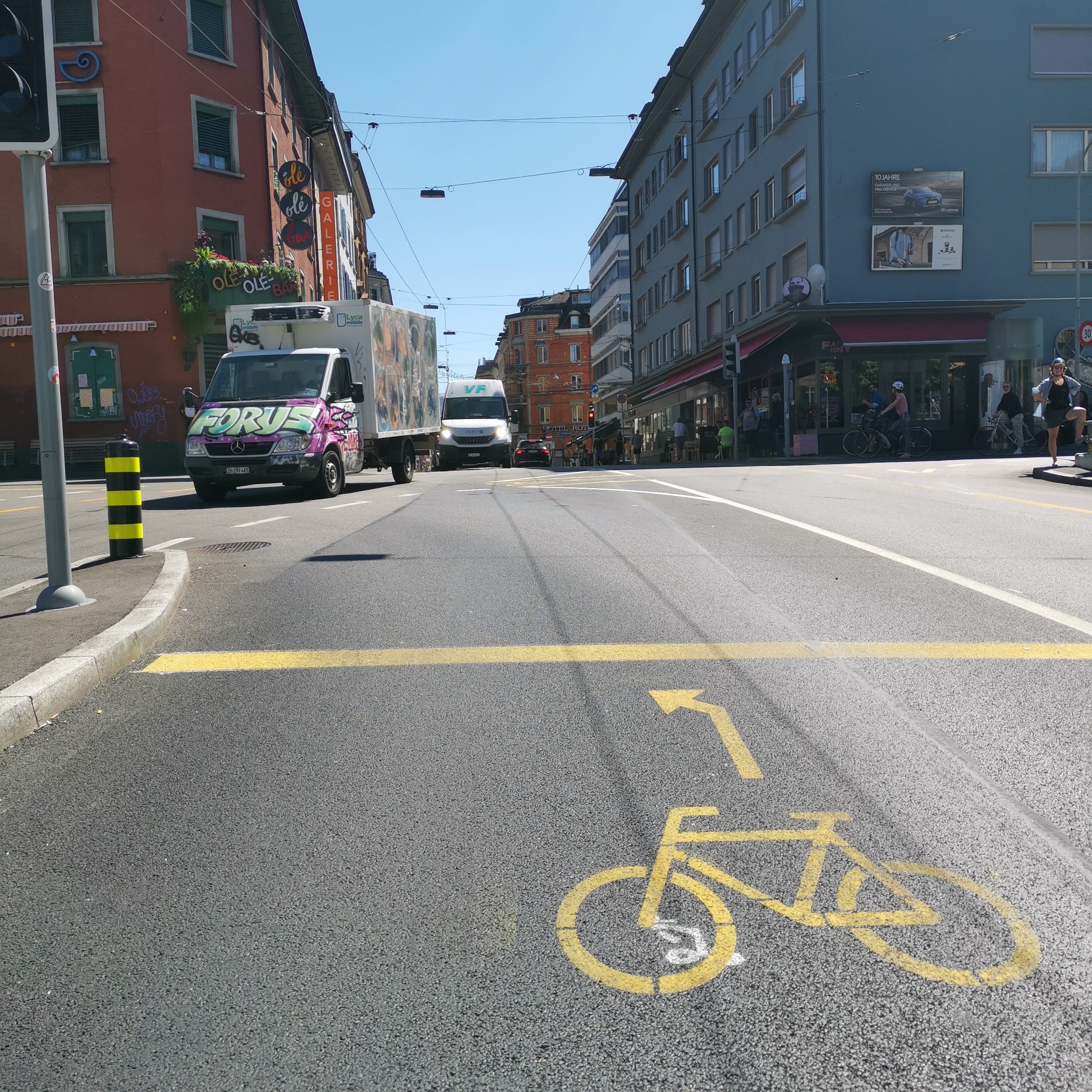…in die Lagerstrasse kommen nur Mutige auf dem direkten Weg. Es gibt zwar einen Velosack vor dem Lichtsingal, aber das Wechseln auf die Spur zum Linksabbiegen ist nur was für Wagemutige.