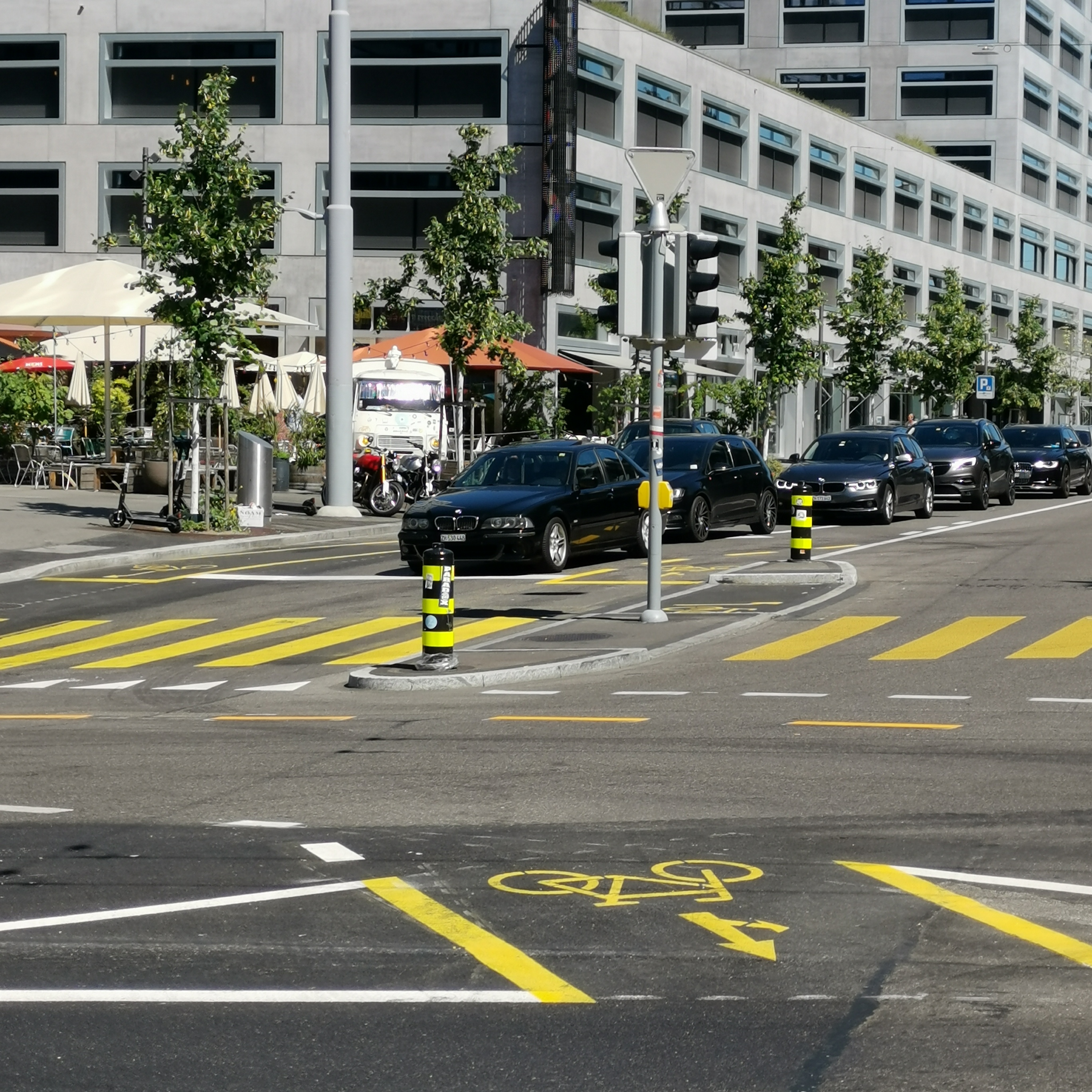…Richtung Helvetiaplatz gibt es neu mitten auf der Strasse eine Wartezone. Zu hoffen ist, dass die Lichtanlagen den Velofahrenden hier immer freie Fahrt bescheren – ansonsten wirds ungemütlich.