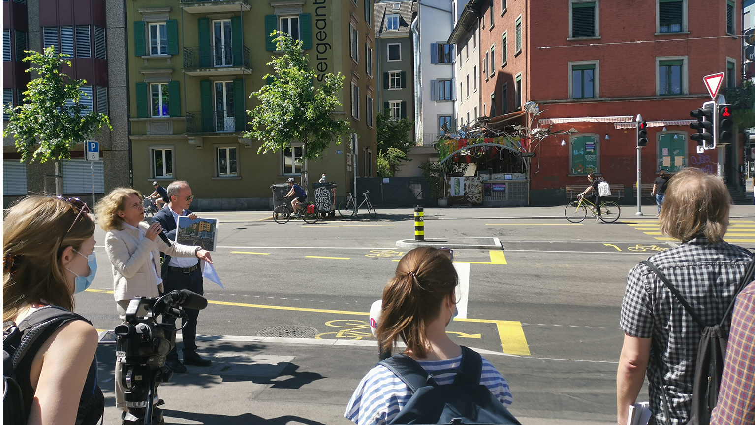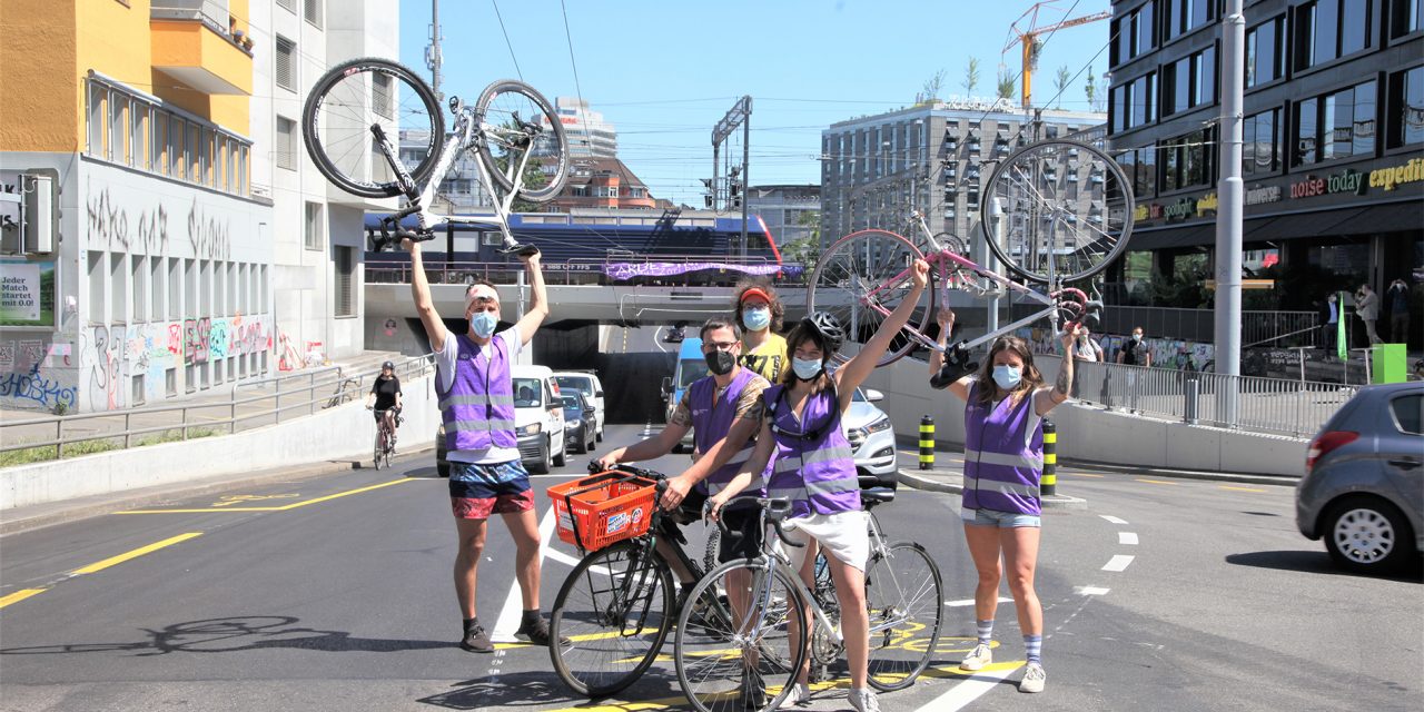 Kaum hat Stadträtin Karin Rykart das Wort ergriffen, sprengen die Velo Mänsche Züri die Medienkonferenz zu den Velomassnahmen rund um die Langstrassenunterführung. Mit Verbänden um den Kopf und Pflästerli im Gesicht verleihen sie der Vorsteherin des Sicherheitsdepartements den «goldenen Randstein» – derweil über der Unterführung ein violettes Transparent mit der Aufschrift «Farbe ≠ Infrastruktur. Velostadt Zürich bauen statt malen» im Wind flattert.
