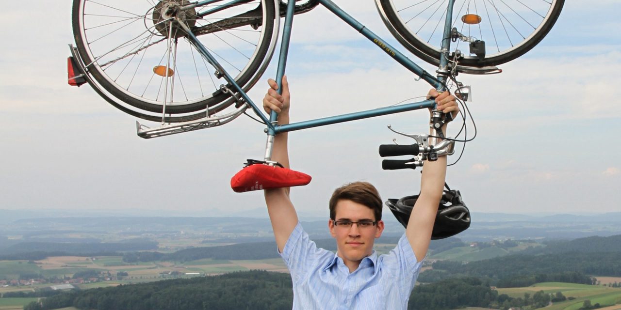 Wir stellen unsere Räder ab und erklimmen den Aussichtsturm beim Heerenbänkli. Auf der Plattform, 694 Meter über Meer und hoch über dem Alltag, erwartet uns eine atemberaubende Rundsicht in die Alpen, zum Seerücken und in den Schwarzwald. An speziell klaren Tagen und wenn der Alltag genügend weit weg gerückt ist, sieht man sogar die Brandung der Nordsee… Während wir von der Ferne träumen, hören wir Treppengeräusche. Es dauert lange, bis der Neuankömmling endlich die Plattform erreicht hat. Kein Wunder, trägt er doch sein Velo mit hinauf! Was man nicht alles auf sich nimmt für ein aussergewöhnliches Selbstportrait. Exklusiv fürs Velojournal dürfen wir ein Erinnerungsbild knipsen. Danach räumen wir das Feld und steigen vom Turm hinab. Wanderer, die bereits weitergezogen sind, haben in der nahen Feuerstelle eine schöne Glut hinterlassen. Schade, haben wir keine Wurst dabei.