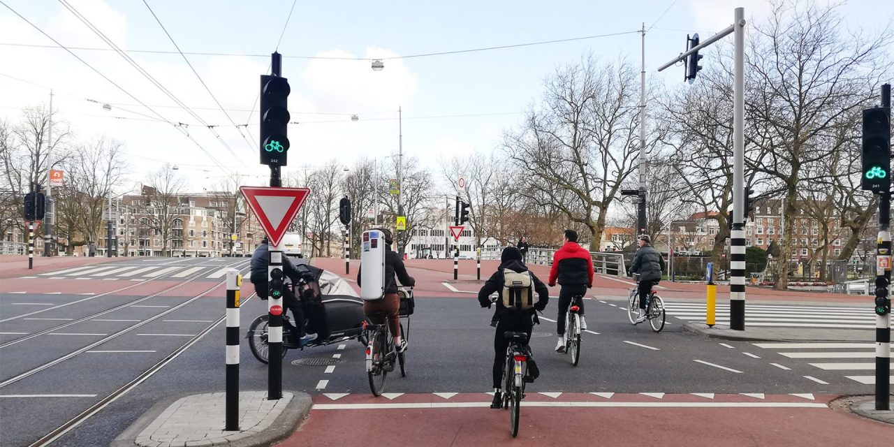 In Amsterdam haben Velofahrende im Kreisverkehr meist eine eigene Spur, auf der sie vortrittsberechtigt sind.