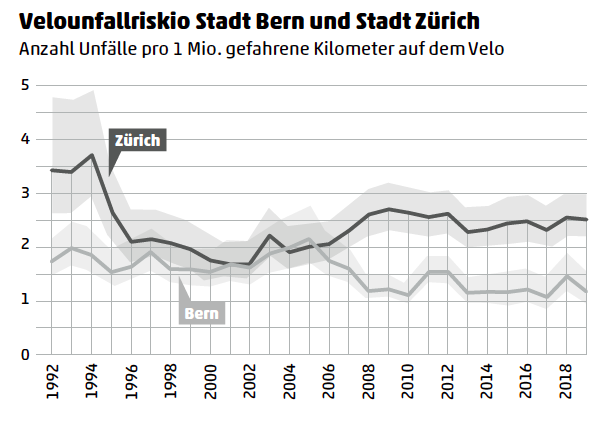 Als Datengrundlage dienten Hirsiger die Mikrozensusdaten «Mobilität und Verkehr» und die Bevölkerungsdaten vom Bundesamt für Statistik sowie die Unfalldaten des Bundesamts für Strassen. Daraus errechnete er die Unfallwahrscheinlichkeit pro Million Velokilometer. Sein Fazit ist erschreckend: Das Unfallrisiko für Velofahrende in Zürich ist seit einigen Jahren doppelt so gross wie in Bern.