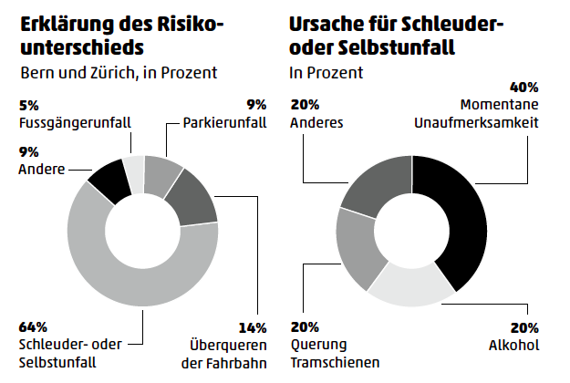 Dabei ist der Unterschied bei den Schleuder- oder Selbstunfällen für über 60 Prozent des Risikounterschiedes zwischen Bern und Zürich verantwortlich. Schleuder- oder Selbstunfälle haben in beiden Städten hauptsächlich drei Ursachen: 2019 war in Zürich in rund 40 Prozent aller Fälle Unaufmerksamkeit massgebend für einen Schleuder- oder Selbstunfall, und in je 20 Prozent der Fälle waren entweder Alkohol oder eine Tramschiene involviert. In Bern gibt es pro Jahr grössere Schwankungen bei den Unfallursachen. Dies erklärt sich mit der kleineren Anzahl an Velounfällen. Im Schnitt ist sowohl in Zürich als auch in Bern die allgemeine Unaufmerksamkeit die häufigste Ursache für einen Schleuder- oder Selbstunfall.