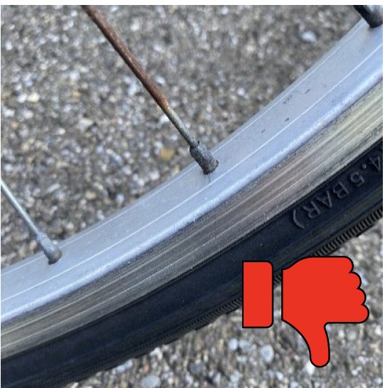 Hände weg von billigen, einwändigen Felgen. Auch verrostete Speichen können gefährlich werden. Für Profis: Verschleiss der Bremsfläche prüfen.