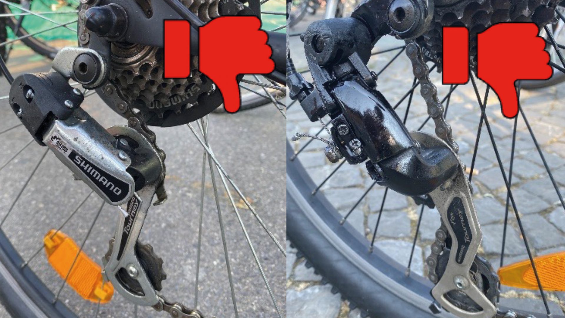 Schaltwerke mit akzeptabler Qualität weisen auch nach langer Benutzungsdauer beim Wechsler ein seitliches Spiel unter zwei Zentimeter auf. Billige Schaltwerke bewegen sich auch im Neuzustand zu leicht. Für Profis: Bei Schaltwerken mit ungenügender Qualität drehen zwei Blechteile um einen Bolzen. Beim Schalten auf den grössten oder kleinsten Ritzel der Kassette kann sich die Kette deshalb zwischen Speichen und Kassette oder zwischen Rahmen und Kassette verklemmen. Eine Reparatur ist aufwändig und daher teuer. Sie kann schnell den Kaufpreis des Occasions-Velo übersteigen. Einzige Ausnahme: Vintage Rennräder mit Originalausstattung werde akzeptiert