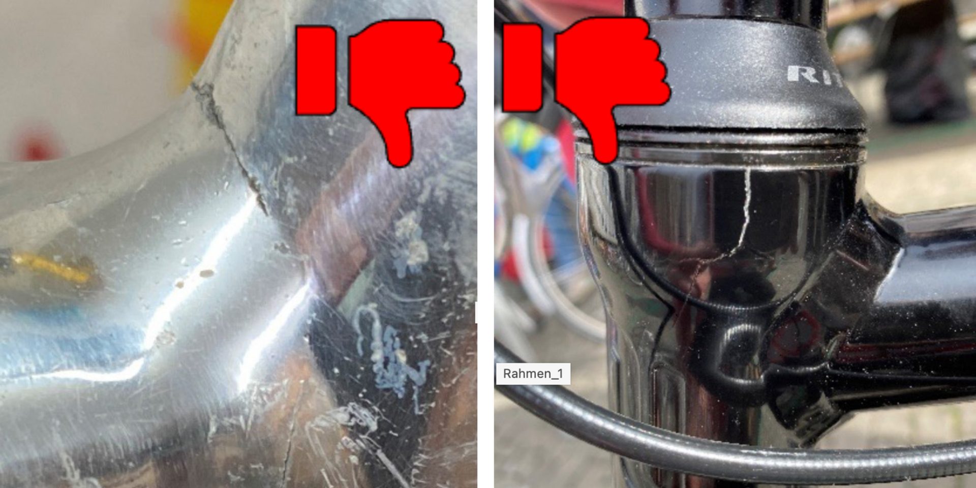 Der Rahmen sollte frei von Rissen sein. Für Profis: Die Knotenpunkte des Rahmens prüfen. Typische Stellen für Rahmenbrüche sind Schweissnahtränder oder mittig in der Naht.