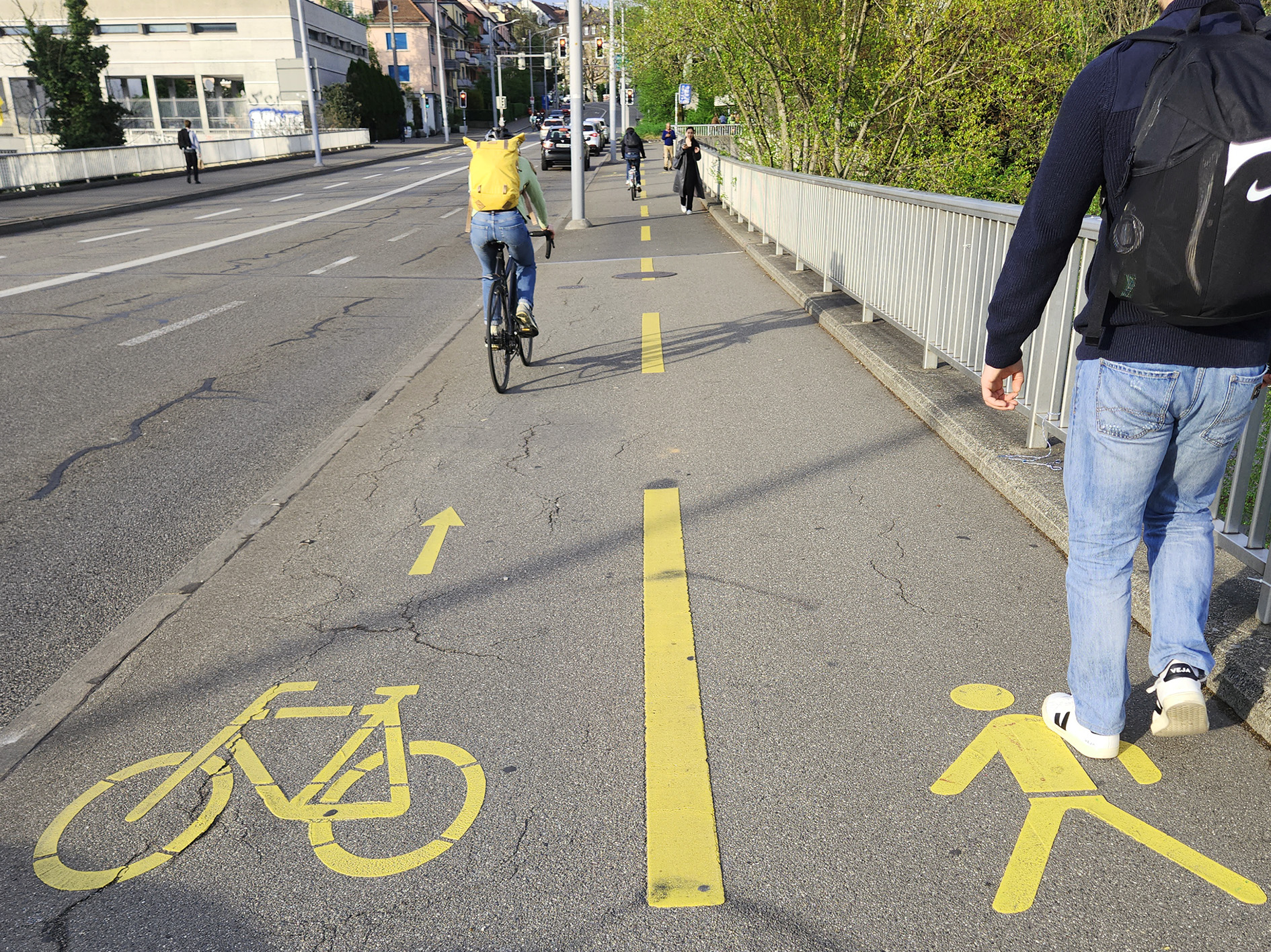 Farblich abgetrennte Bereiche auf der Kornhausbrücke: Zufussgehende und Velofahrende wissen, wo sie gehen beziehungsweise fahren sollten.