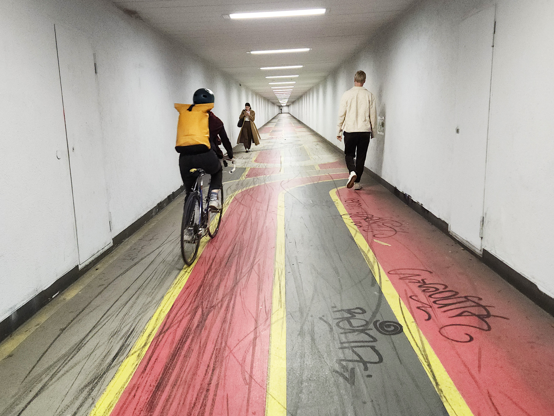 Viel Farbe, aber wenig Klarheit: Im Nebenstollen des Ulmbergtunnel teilen sich Zufussgehende und Velofahrende.
