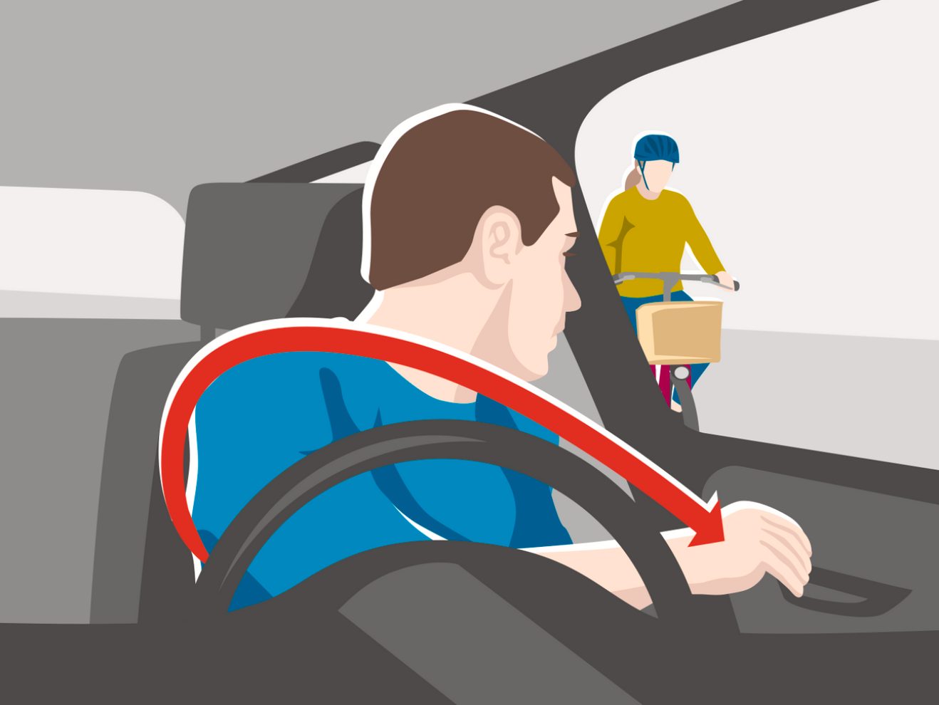 - Öffne die Autotür mit dem holländischen Griff. Dabei öffnest du die Tür mit der Hand, die weiter vom Türgriff entfernt ist. Dank diesem Trick drehst du den Oberkörper zur Strasse ab, schaust automatisch zurück und siehst die Velofahrerin oder den Velofahrer rechtzeitig.