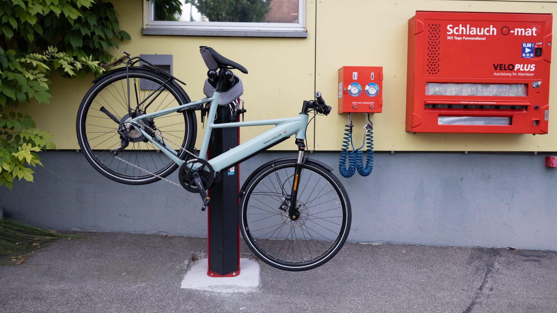 Vor der Veloplus-Filiale in Wetzikon gibt es einen Montage-Ständer, der rund um die Uhr zugänglich ist. Er ist mit den wichtigsten Werkzeugen wie Inbusschlüssel, Reifenheber, Torx und Pedalöffner ausgestattet.