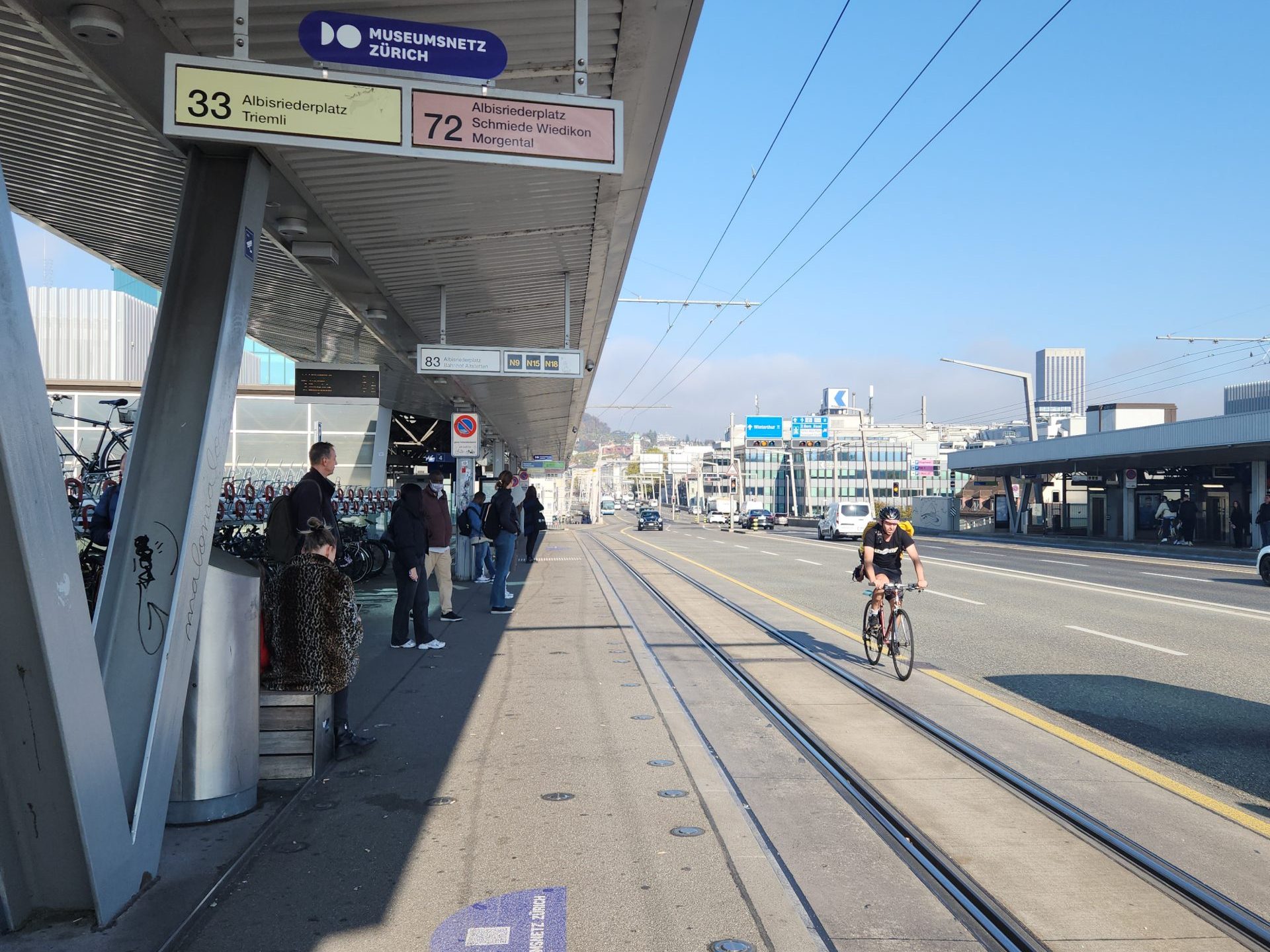Da der offizielle Veloweg auf der Hardbrücke durch die Bushaltestelle führt, fahren die Mutigen zwischen Tram- und Autospur.